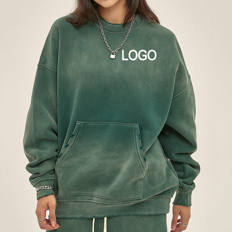 Nama produk: | Custom 360G Cotton tebal Terry Perancis Fleece Spray Dyeing 10 Warna Unisex Wanita Pria Oversized Lolos Drop Bahu Vintage Acid Wash Lenyap Penderitaan robek Sweater Hoodie |